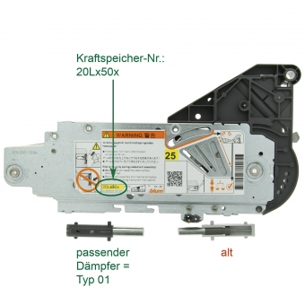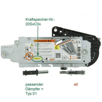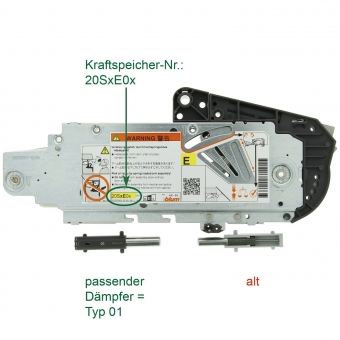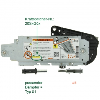 - Welcher Dämpfer benötigt wird, ist ausschließlich anhand der Tabelle zu erkennen! Dazu ist die Blum-Kraftspeicher-Nr. (auf dem Kraftspeicher zu sehen) erforderlich.