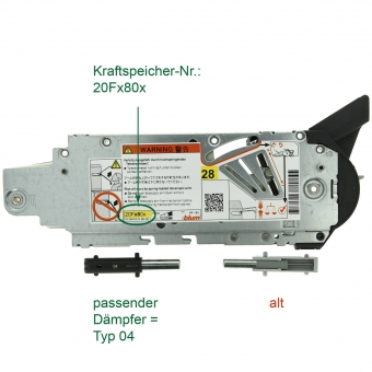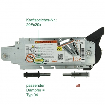 Welcher Dämpfer benötigt wird, ist ausschließlich anhand der Tabelle zu erkennen! Dazu ist die Blum-Kraftspeicher-Nr. (auf dem Kraftspeicher zu sehen) erforderlich.