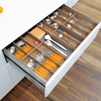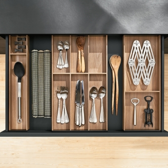Das Inneneinteilungssystem ist in Material und Farbe passend zur Zarge erhältlich oder setzt mit ausgewählten Holzdekoren bewusst Akzente.