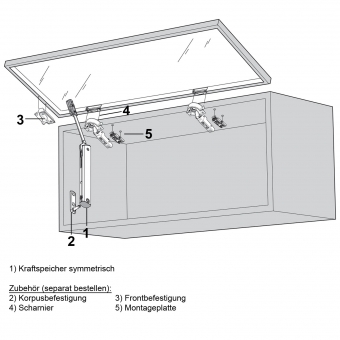 Korpusbefestigung: Für die Befestigung des Kraftspeichers am Korpus stehen unterschiedliche Befestigungsarten zur Verfügung. Unabhängig von Dicke und Material der Front bleiben die Befestigungspositionen immer gleich.