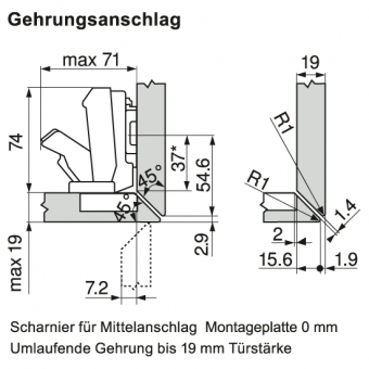 Mit dem gekröpften Scharnier können Anschläge mit einer 4-seitigen (umlaufenden) Gehrung bis Türstärke 19 mm ausgeführt werden.