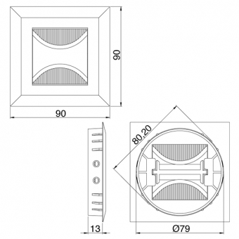 Maße: Bohrung 80 mm - Kantenmaß 90 x 90 mm