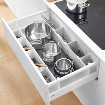 ORGA-LINE, das Inneneinteilungssystem von Blum, macht es einfach, Ordnung zu halten. Für ein harmonisches Erscheinungsbild gibt es ORGA-LINE für Frontauszüge in einer auf Design und Farben von TANDEMBOX intivo abgestimmten Variante (in seidenweiss, terraschwarz und für inox in grau / RAL 7037.