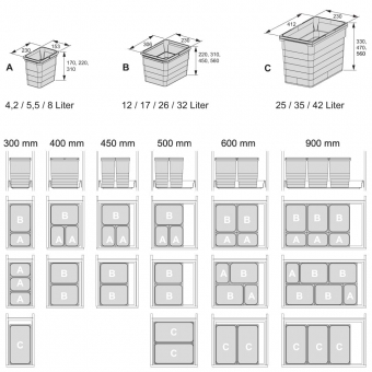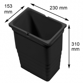 Kombinierbare Behältergrößen ermöglichen Individuallösungen für eine praktische und effektive Abfalltrennung. Die dunkelgrauen Kunststoffbehälter mit 2 schwenkbaren Tragegriffen gibt es in den Höhen 170-560 mm, das Fassungsvermögen beträgt 4,2-35 Liter.