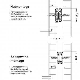 Maximale Schubkastenbreite: lichte Korpusbreite -25,4 mm bei Nutmontage + doppelte Nuttiefe