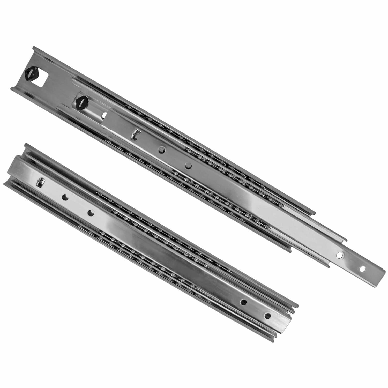 Die Teleskopschienen sind in den Einbaulängen 300-1100 mm erhältlich und haben eine Tragkraft von 60 bis 150 kg. Die Höhe beträgt 53 mm, die Schienendicke 19,1 mm. Eine Rückhaltesicherung hält die Schublade in geschlossener Position. Die Auszugschienen können seitlich an der Schublade oder am Tablar aufliegend montiert werden.