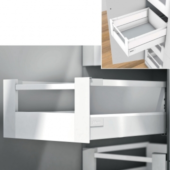 Eine puristische Farb- und Formgebung zeichnet TANDEMBOX antaro aus. Charakteristisch für dieses Boxsystem ist die eckige Reling. Mit Einschubelementen lassen sich nicht nur geschlossene Behältnisse individuell realisieren.