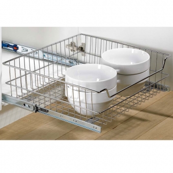 Breitenverstellbarer Drahtkorb-Vollauszug für Unterschränke aus verchromtem Stahl mit 35 kg Tragkraft zum Einbau hinter einer Tür. Der Kugelauszug mit Dämpfung (Silent System) sorgt für ein gedämpftes Schließen der Führung.