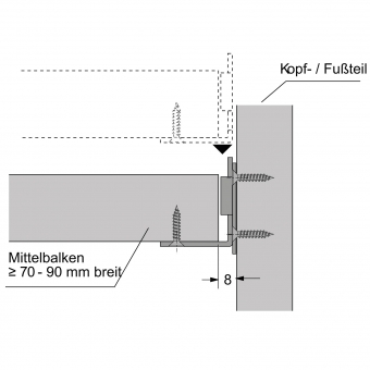 Der Verbinderwinkel / Tragwinkel gehört an die Stirnseite des Auflagers/Brettes, die Verbinderplatte ( Haltelasche) an Kopf- bzw. Fußteil vom Bett.