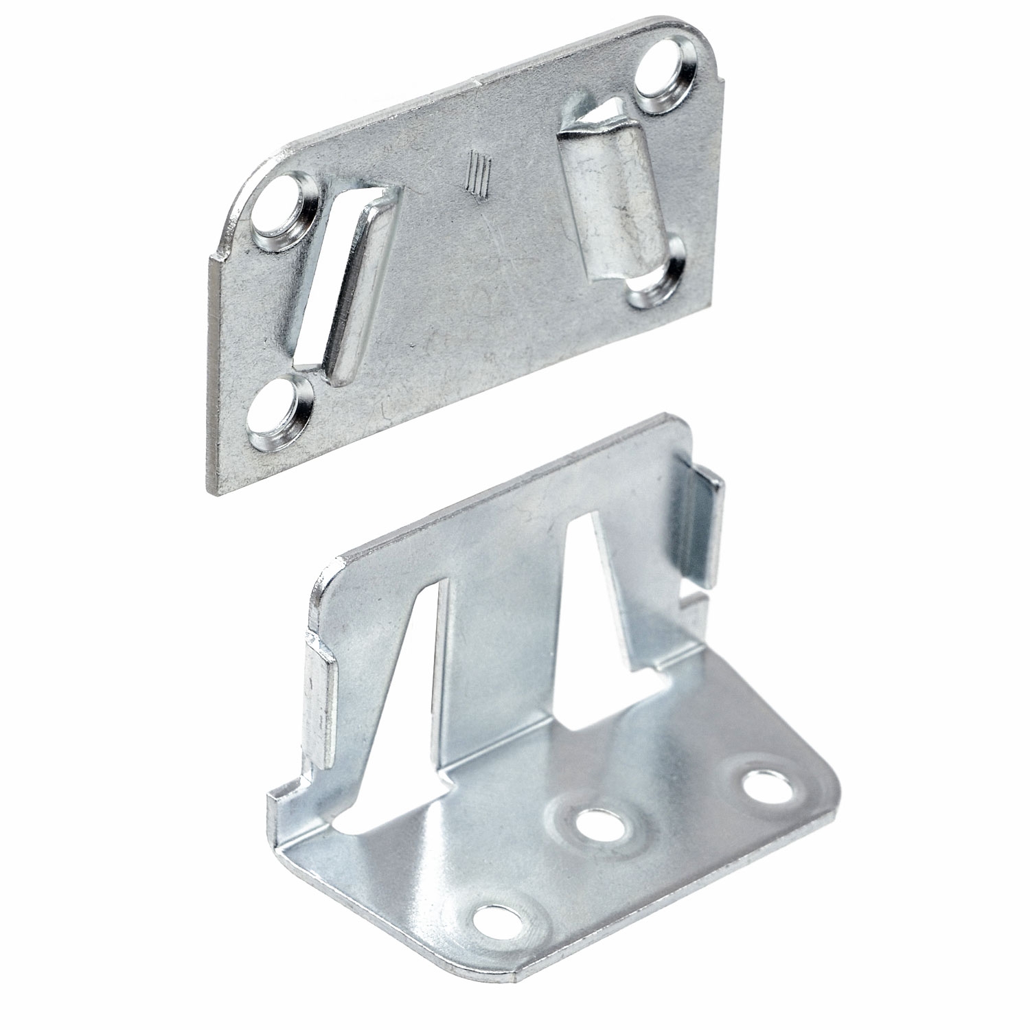 Dieser Mittel Bettverbinder ist zweiteilig und besteht aus einem Verbinderwinkel (Tragwinkel) und einer Verbinderplatte (Lasche).