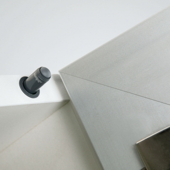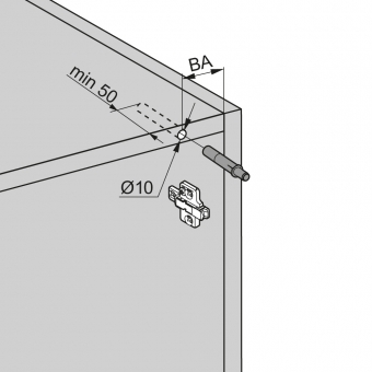 Der BLUMOTION 970A Tür Dämpfer von Blum wird scharnierseitig eingebohrt oder in Verbindung mit einer Adapterplatte (siehe Zubehör) angebracht und gewährleistet die perfekte Bewegung der Scharniere auch bei Winkelscharnieren. Zunächst sollte der BLUMOTION 970A Türpuffer im Oberboden des Möbel- /Küchenkorpus auf der Scharnierseite eingebohrt oder mit der Adapterplatte (siehe Zubehör) angebracht werden.