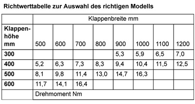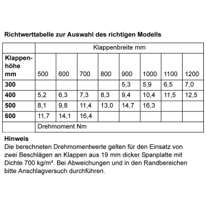 Die berechneten Drehmomentwerte gelten für den Einsatz von zwei Beschlägen an Klappen aus 19 mm dicker Spanplatte mit Dichte 700 kg/m³. Bei Abweichungen und in den Randbereichen bitte Anschlagversuch durchführen.
