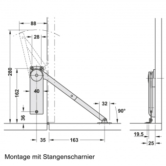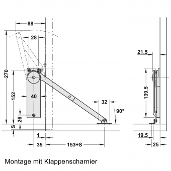 Bestellhinweis: In Verbindung mit dem Bremsklappenhalter empfehlen wir den Einsatz der Klappenscharniere Hettich Markant 11 Artikel 81151353000 oder Klapptischscharniere Artikel 45243819000 - siehe unten.