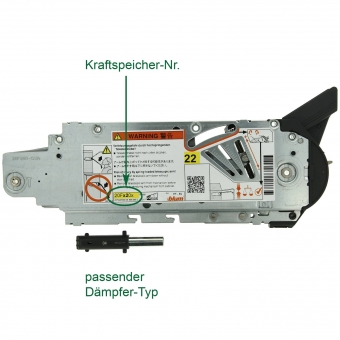 - Welcher Dämpfer benötigt wird, ist ausschließlich anhand der Tabelle zu erkennen! Dazu ist die Blum-Kraftspeicher-Nr. (auf dem Kraftspeicher zu sehen) erforderlich.