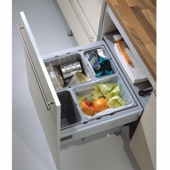 Kombinierbare Behältergrößen ermöglichen Individuallösungen für eine praktische und effektive Abfalltrennung. Die alu-grauen Kunststoffbehälter mit 2 schwenkbaren Tragegriffen gibt es in den Höhen 170-560 mm, das Fassungsvermögen beträgt 4,2-32 Liter. Die Abfalleimer lassen sich herausnehmen.