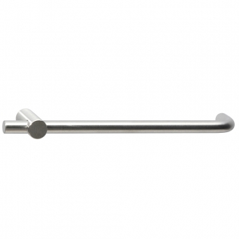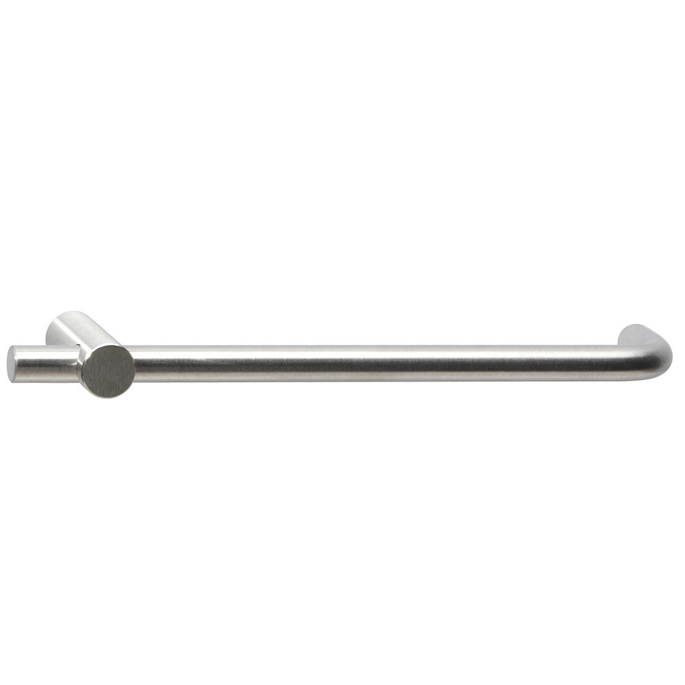 Bügelgriff mit interessanter Wendung: eine Seite ist gebogen, auf der anderen gibt es einen Sockel, der von dem Rundstab durchdrungen wird. Pures Design mit Hingucker-Effekt.
