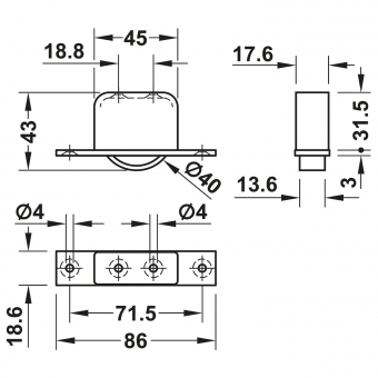 Einlassmöbelrolle aus Kunststoff, grau / anthrazit - für Holzdicke >22 mm - weiche Lauffläche - Tragkraft 60 kg - Breite 18,6 mm - Rad-Ø 40 mm - zum Schrauben - 1 Rolle - Länge 86 mm - Höhe 43 mm