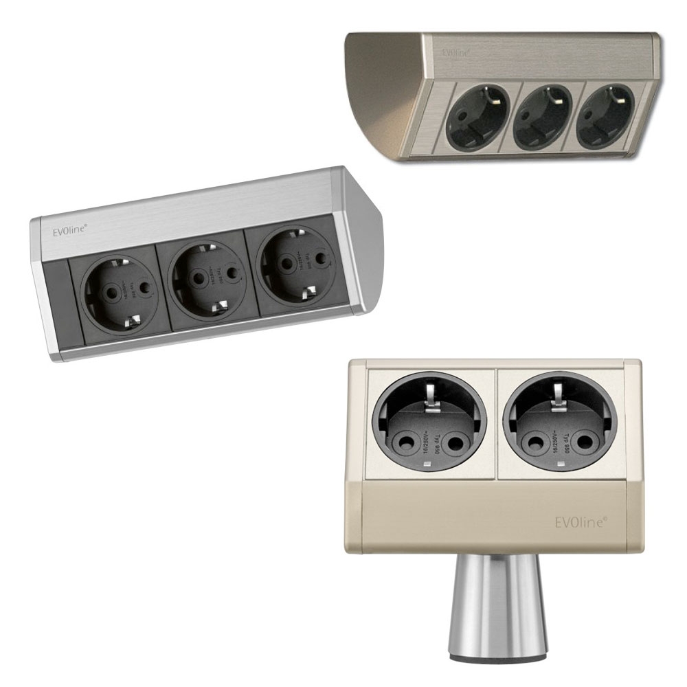 Die zeitlos schönen Steckdosenelemente von Evoline vereinen Funktionalität und Design. Man kann sie einfach dort montieren, wo gerade Strom benötigt wird - z. B. zum optimalen Einbau unter Hängeschränke oder Arbeitsplatten (Dock SMALL oder als Kochinsel-Steckdose (T-Dock).