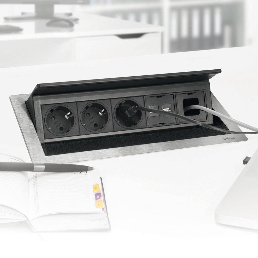 Der EVOline FlipTop Push ist eine elegante Einbaulösung für alle Arbeitsbereiche, die mit Strom, Daten und Multimedia versorgt werden müssen. Die Power Ports sind vielfach einsetzbar - z. B. in Office, Küche und Hotel.