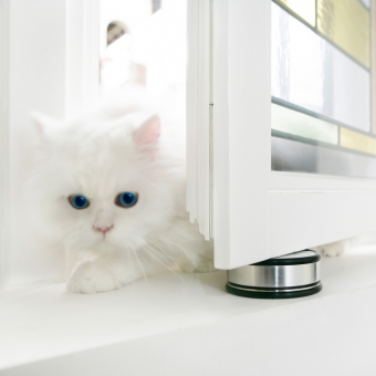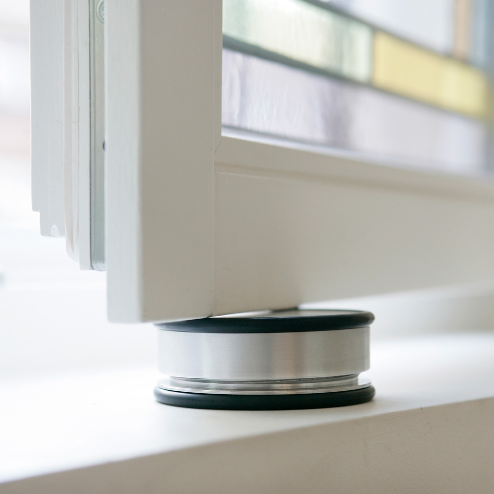 Der Türstopper besteht aus Edelstahl und Aluminium mit 2 rundumlaufenden schwarzen Gummiringen. Aufgrund des guten Gewichts ist WINDOW STOP auch als Bodentürstopper einsetzbar.