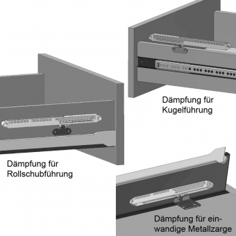 Hier können Sie eine nachrüstbare Schubladendämpfung kaufen, wie sie in vielen Schubkastensituationen vorkommt. Der Dämpfer ist passend für Rollschubführungen, Kügelführungen und Metaboxen (einwandige Stahlzargen).
