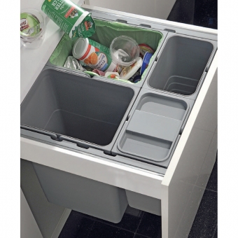 Passend für 310 mm hohe Behälter (8 und 17 Liter) und Großraumbehälter 450 mm hoch (26 Liter) sowie 470 und 560 mm hoch (35 und 32 Liter). Kombinierbare Behältergrößen ermöglichen Individuallösungen für eine praktische und effektive Abfalltrennung. Die dunkelgrauen Kunststoffbehälter mit 2 schwenkbaren Tragegriffen gibt es in den Höhen 275-560 mm, das Fassungsvermögen beträgt 6-35 Liter. Die Abfalleimer lassen sich herausnehmen.