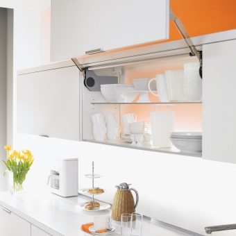 Die Hochliftklappe ist gut für kleinflächigere, einteilige Fronten und ideal für den mittleren bis hohen Oberschrank, oder für den Nischenschrank mit darüber liegenden Fronten geeignet. AVENTOS HL ermöglicht u. a. den Einbau von Elektro-Geräten im Hochschrank.