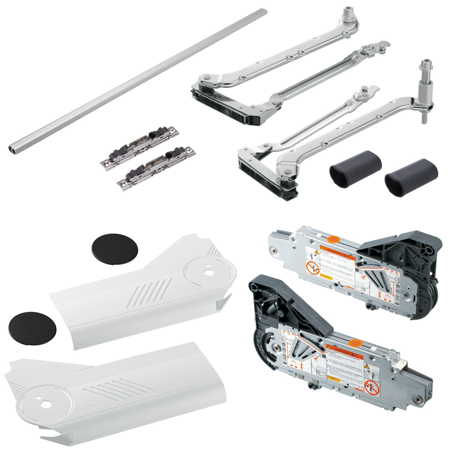 - 2 x Kraftspeicher - Befestigungsmaterial - 2 x Hebelpaket - 2 x Abdeckkappen-Set - Frontbefestigung f. Holzfronten (2 Stk.) - Querstabilisierungsstange oval 1061 mm