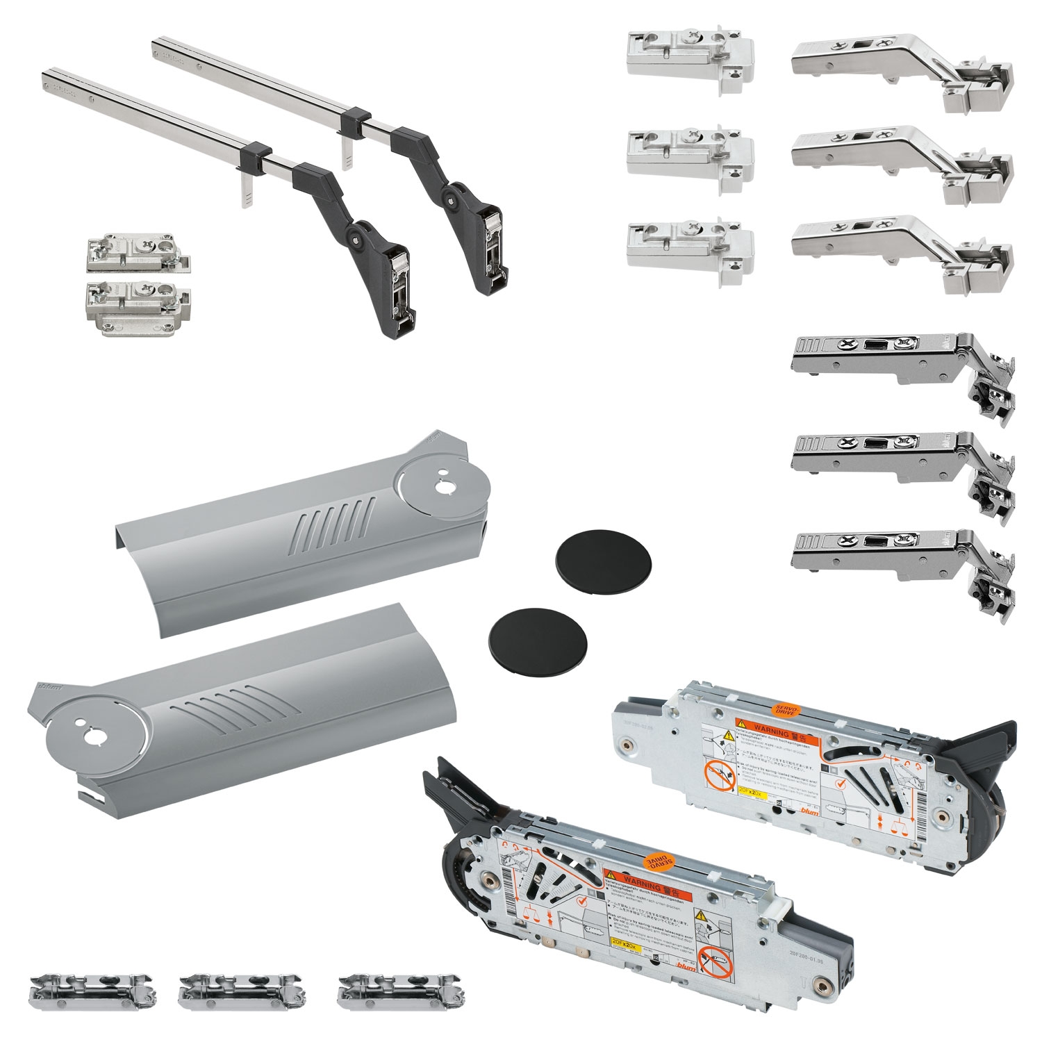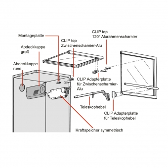 - 2 x Kraftspeicher - Abdeckkappenset grau (li/re) - 10 x Spanplattenschrauben Ø 4 x 35 mm - 2 x Teleskophebel - 3 x 120°-Aluscharnier + 3 x Zwischenscharnier-Alu (jew. ohne Feder / Schraubversion) - 3 x Montageplatte - 3 x Adapterplatte