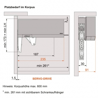 ist gut geeignet für geringe Korpushöhen im Oberschrank, im Hochschrank