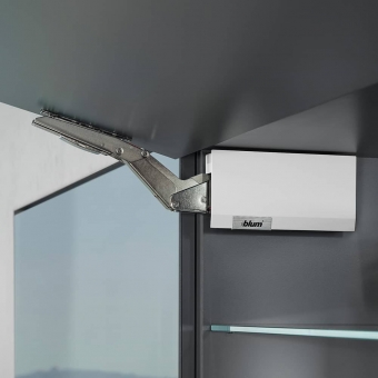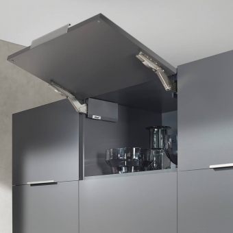Der Klappenbeschlag Blum Aventos HK TOP Hochklappe ist gut geeignet für geringe Korpushöhen im Oberschrank, im Hochschrank und über dem Kühlschrank. Korpushöhe 205-600 mm und für Korpusbreite bis 1800 mm.