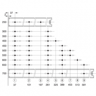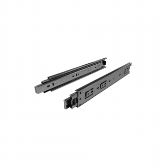 Die Kugelkäfig-Vollauszüge aus verzinktem Stahl für 32 mm Lochabstände sind mit Hilfe eines Hebels aushängbar. Die Auszüge sind für die Schranktiefen 255-710 mm erhältlich, haben eine Höhe von 45 mm und der seitliche Abstand beträgt 12,7 mm. Die Kugelauszüge haben eine Tragkraft von 45 kg (bei Länge 450 mm). Eine Rückhaltesicherung hält die Schublade in geschlossener Position.
