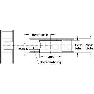 Bohrmaß B: Abstand von Maxifix-Gehäusemitte bis Vorderkante Tablar 35 / 55 mm (abhängig vom gewähltem Bolzen)