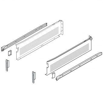 - 1 Paar Zargenführungen (rechts/links) - 1 Paar Korpusschienen (rechts/links) - 1 Paar Standard-Frontbefestigungen (rechts/links) - 2 Abdeckkappen