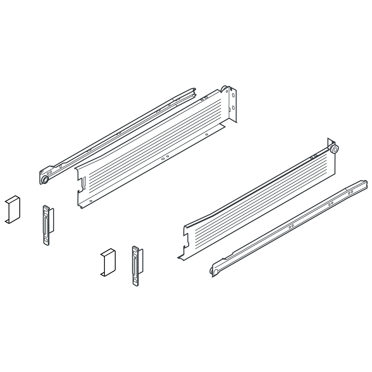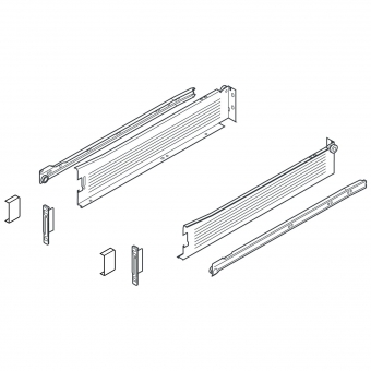 - 1 Paar Zargenführungen (rechts/links) - 1 Paar Korpusschienen (rechts/links) - 1 Paar Standard-Frontbefestigungen (rechts/links) - 2 Abdeckkappen