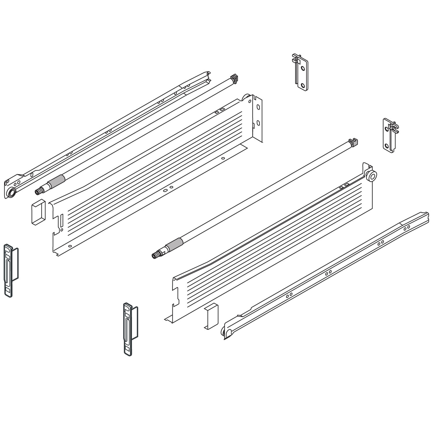 - 1 Paar Zargenführungen (rechts/links) - 1 Paar Korpusschienen (rechts/links) - 1 Paar Standard-Frontbefestigungen (rechts/links) - 2 Abdeckkappen - 2 x Längsreling mit Rückwandhalter (rechts/links)