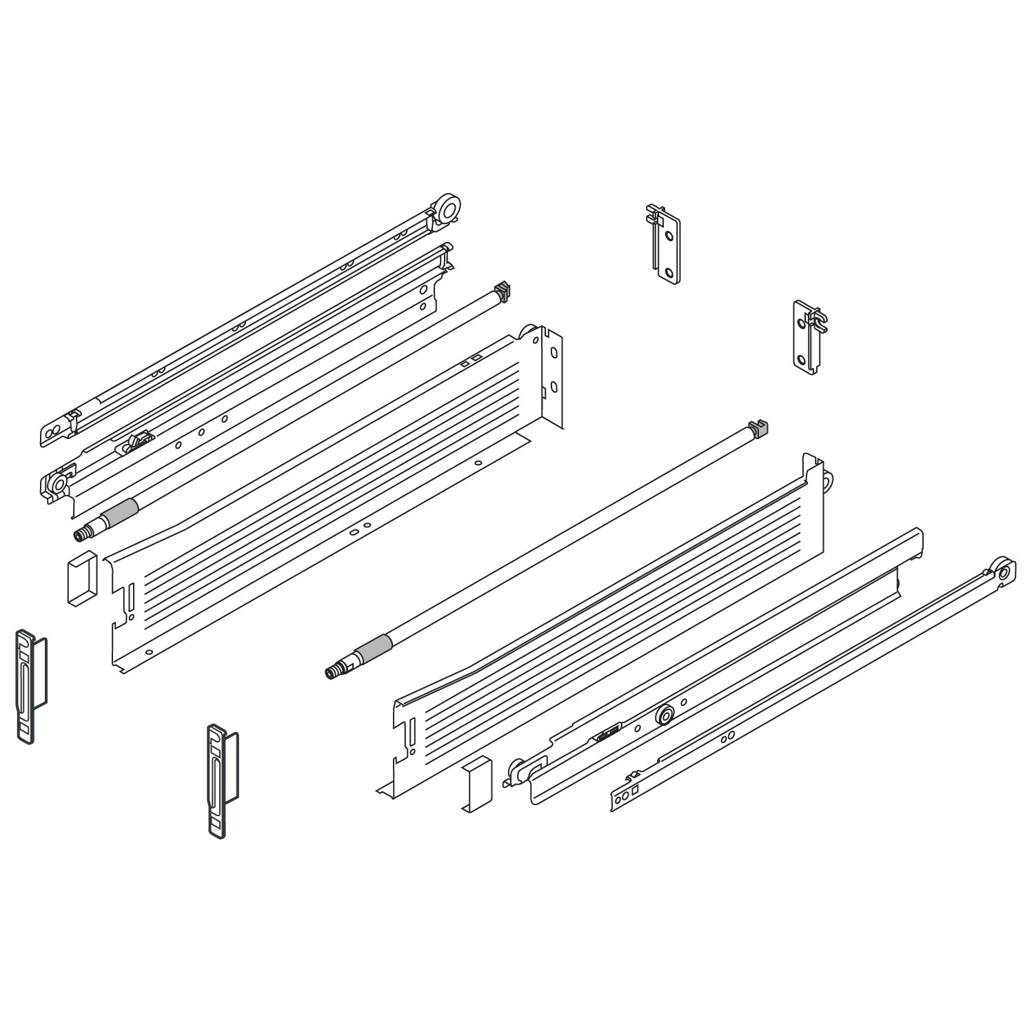 - 1 Paar Zargenführungen (rechts/links) - 1 Paar Korpusschienen (rechts/links) - 1 Paar Mittelschienen (rechts/links) - 1 Paar Standard-Frontbefestigungen (rechts/links) - 2 Abdeckkappen - 2 x Längsreling mit Rückwandhalter (rechts/links)