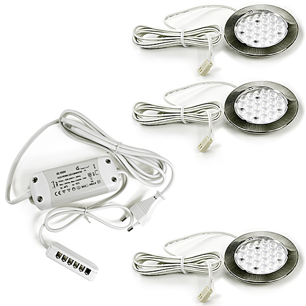 Lieferumfang: 3 x Einbaustrahler inklusive Konverter, 2000 mm langes Verbindungskabel und Micro12-Steckverbindung für LED-Konverter (12 Vdc).