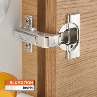 MODUL BLUMOTION Stollenscharnier - speziell mit kurzem Bandarm - ist für innenliegende Stollenanwendungen mit schmalen Stollen besonders geeignet.