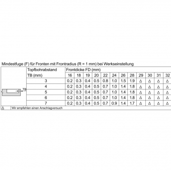 Ein gleichmäßiges Fugenbild wird durch die 3-dimensionale Einstellmöglichkeit erreicht. Bei der Tiefenverstellung ist eine Aushängesicherung integriert. Und ein Topfabdeckrand verdeckt selbst ausgerissene Bohrungen.