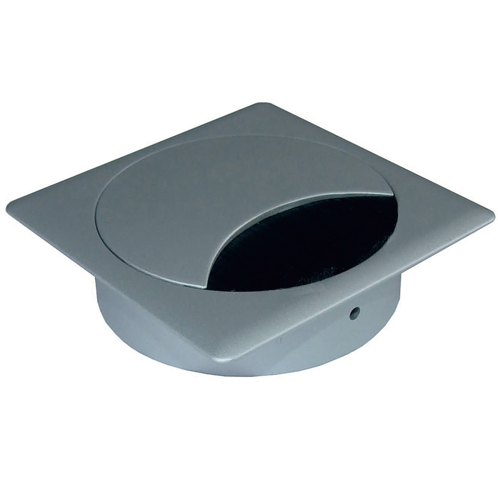 Kabeldurchlass in quadratischer Form aus Zinkdruckguss. Die halbrunden Öffnungen zur Kabeldurchführung sind mit Staubbürsten abgedeckt. Um größere Stecker durchzuführen, kann der Innendeckel problemlos herausgenommen werden.