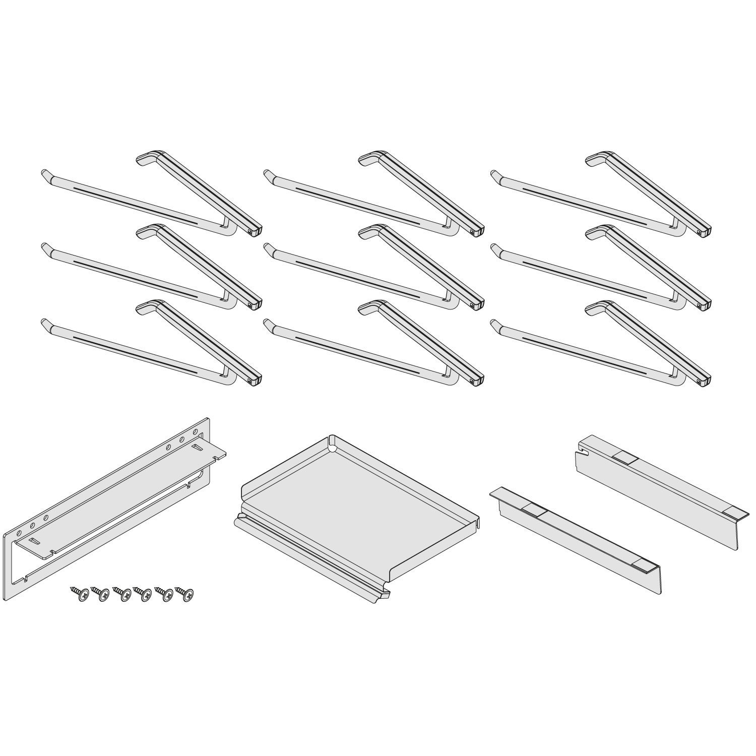 - 1 Tablar - 1 Tablarträger re. - 1 Träger li. - 1 Wandmontageplatte - 9 Bügel