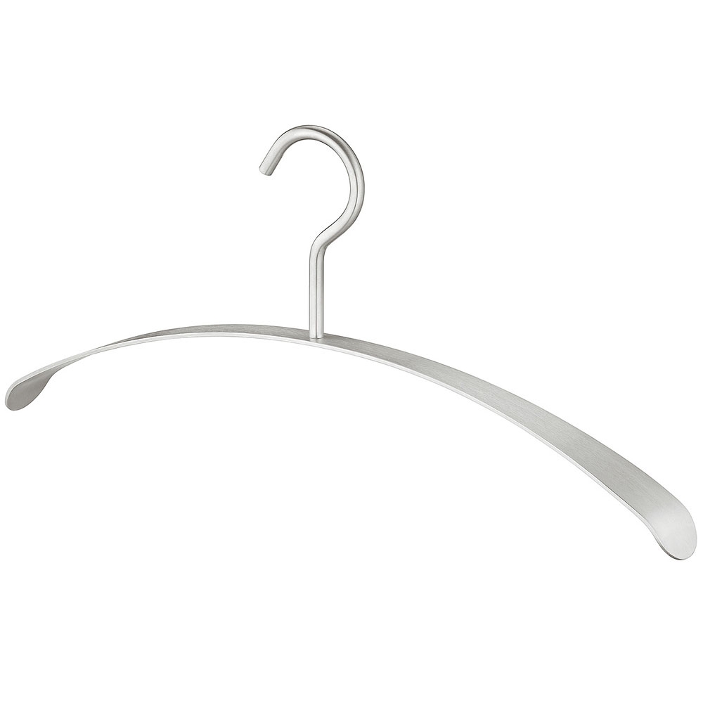 Dieser stilvolle Kleiderbügel aus matt gebürstetem Edelstahl ist an den Bügelenden breiter geformt und erhält dadurch ein stabiles Aussehen. Die Breite des Bügels beträgt 457 mm, die Höhe 194 mm. Der Querschnitt ist 20 x 3 mm.