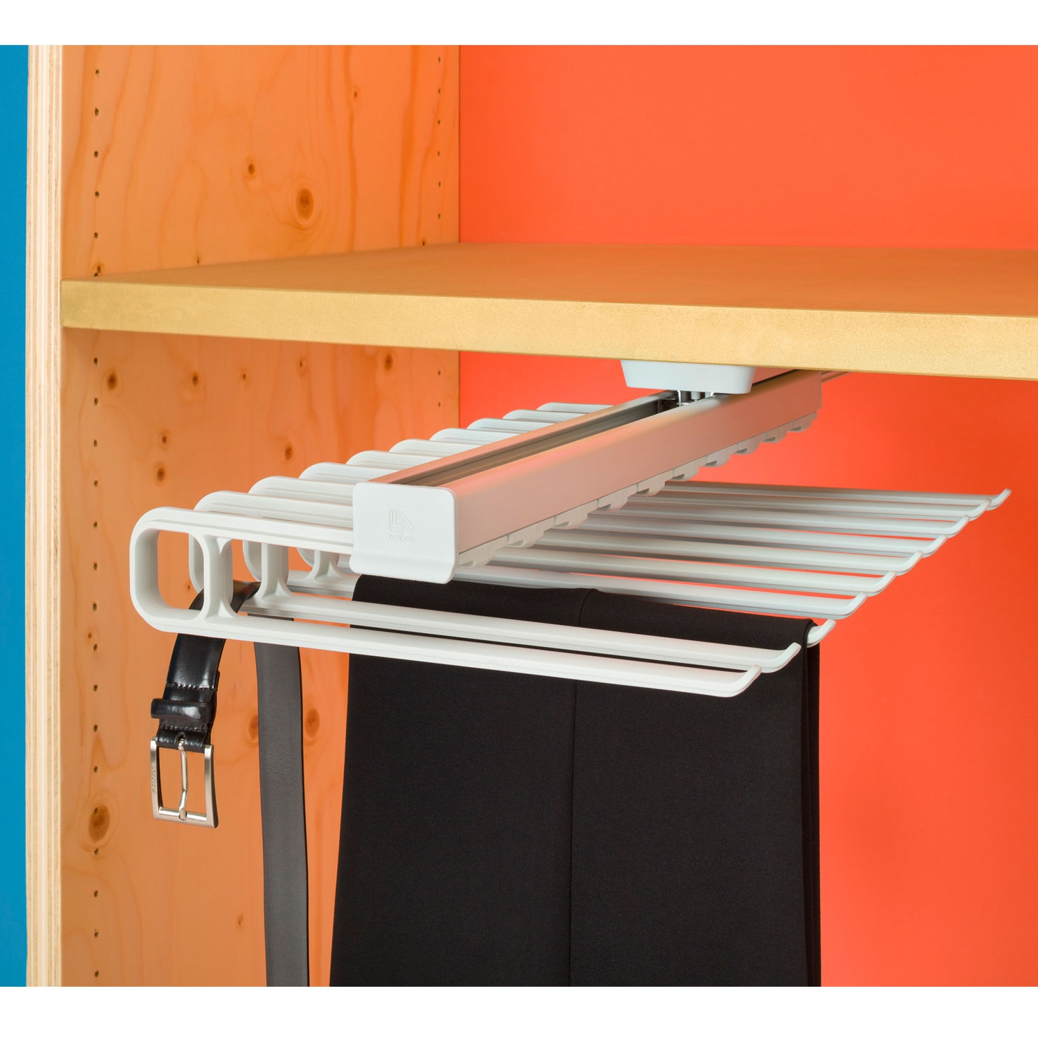 Die Montage erfolgt unter den Ablagebrettern. Die Vorrichtung kann bis zu 10 Hosen aufnehmen. Zur Ausstattung gehört auch ein ringförmiger Sitz für die eventuelle Aufnahme kleiner Accessoires (Gürtel, Krawatten, Halstücher).