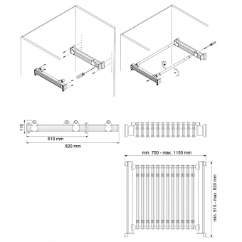 Kleiderauszug mit 12 Kunststoff-Kleiderbügeln - Breite verstellbar 750-1150 mm - für Hosen, Kostüme, Hemden, Krawatten und Gürtel - Länge ausziehbar 510-820 mm