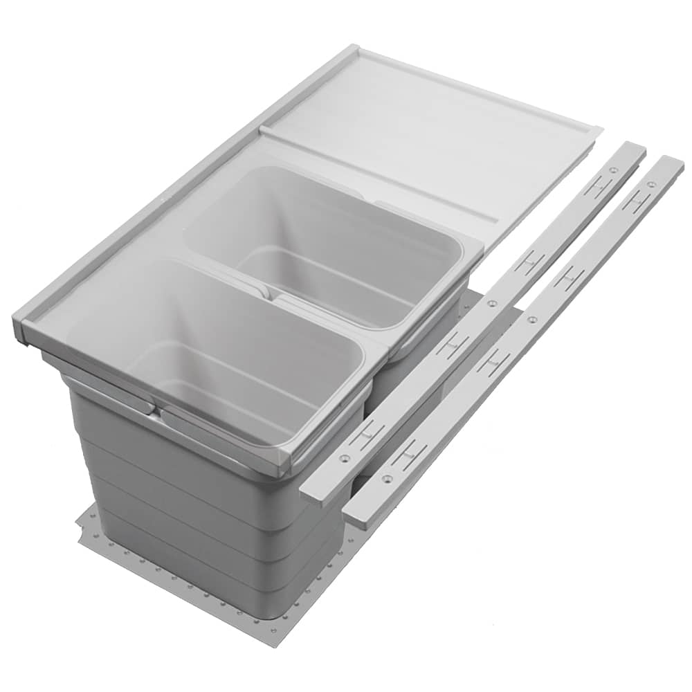 Das System ist rutschfest über eine Bodenplatte fixiert - die über den Eimern installierte Deckelplatte kann als zusätzlicher Ablageboden im Spülenschrank verwendet werden.