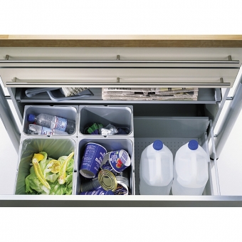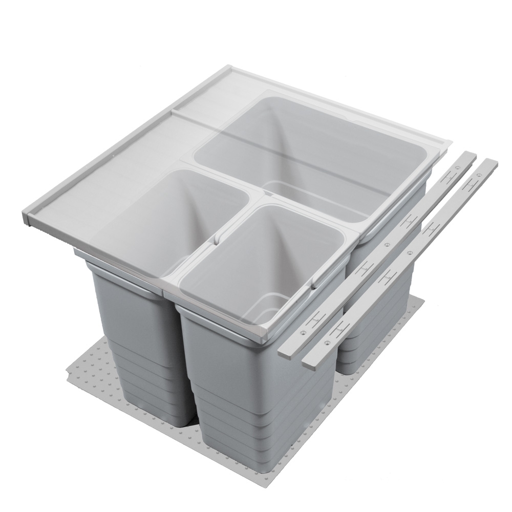 Komplettset eins2vier für den stehenden Einsatz in Vollauszügen - 2 x 8 / 5,5 und 1 x 17 / 12 Liter Eimer, Träger- und Deckelplatte (ohne Zargensystem) - für Korpusbreite 450 mm - Nennlänge 500 mm - für Seitenwanddicke 16 / 19 mm - Eimerhöhe 310 / 220 mm
