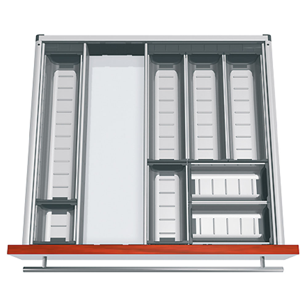 - Abbildung 1 zeigt das System für 500 mm Zargenlänge (NL). Andere Längen unterscheiden sich in Aufteilung und Größe der Schalen. Ein Teil des Schubkastens bleibt frei.