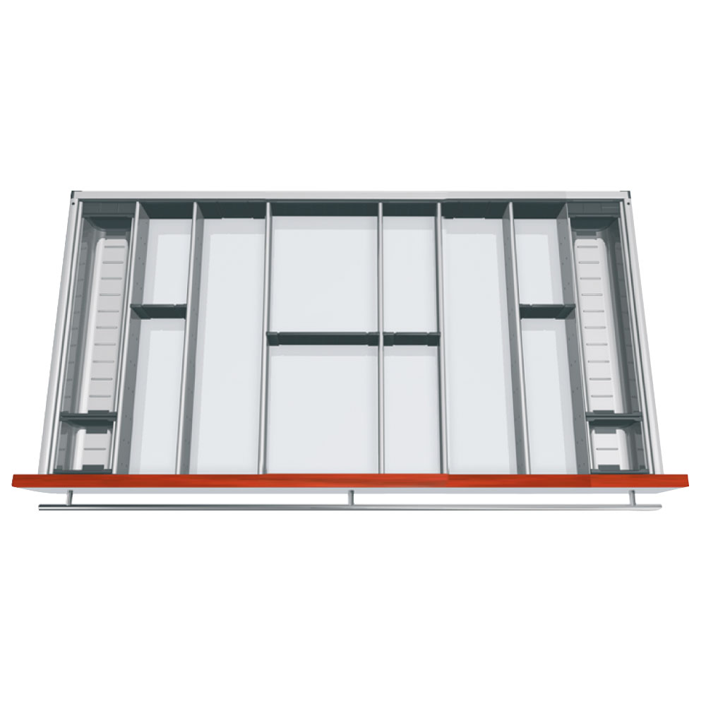 Die Inneneinteilungssysteme von ORGA-LINE sind Sets, die den gesamten Schubkasten ausfüllen. Sie nutzen den Stauraum optimal und sind exakt auf die unterschiedlichen Staugüter abgestimmt. Für hohe Staugüter im Frontauszug werden Längs- und Querteiler, für niedrige Staugüter werden Schalen und Facheinteilungen eingesetzt.