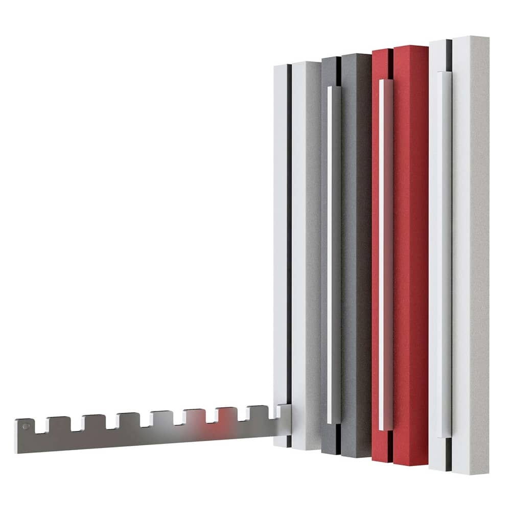 Ausgeklappt präsentiert der Edelstahl-Arm 8 Aussparungen, die auch Kleiderbügel mit dickerem Haken-Querschnitt aufnehmen. Bei Nichtgebrauch wird der Haken eingeklappt und die Schiene magnetisch fixiert.
